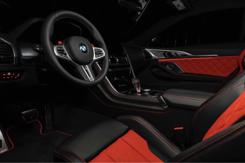 • Wykończenie BMW Individual Full Marino Leather w eksluzywnym dwukolorowym wykończeniu Shakira Orange/ Black z kontrastowymi przeszyciami