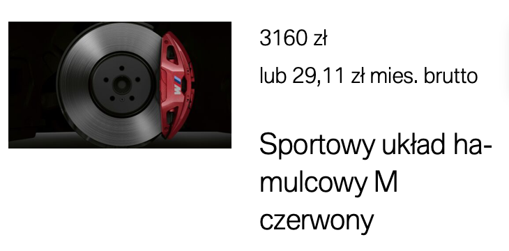 Od teraz czerwony układ hamulcowy dostępny jest jako opcja przy konfiguracji nowego samochodu, ale to nie ten sam zestaw co akcesoryjny… Po prostu to czerwona wersja, niebieskiego zacisku :), dlatego jeśli oczekujesz od swojego samochodu czegoś więcej i układ hamulcowy nie spełnia Twoich oczekiwań, warto zainwestować w sportowy układ hamulcowy M Performance.